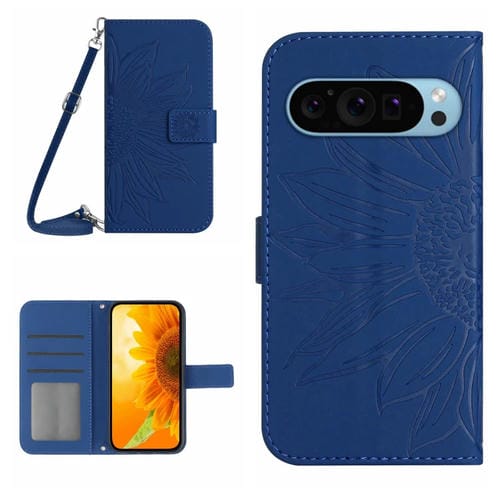 Funda de Cuero con Tapa y Cordón para Google Pixel 9 Pro XL con Diseño de Girasol (Azul Oscuro)