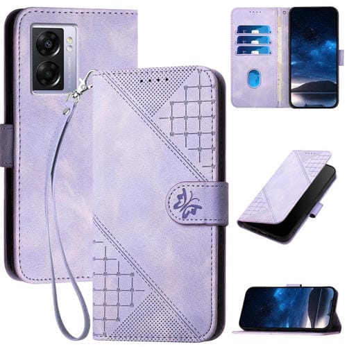 Funda de Cuero con Tapa y Cordón para Oppo A57E 4G Global Yx0080 con Diseño En Relieve de Mariposa y Cuadrícula (Morado Claro)