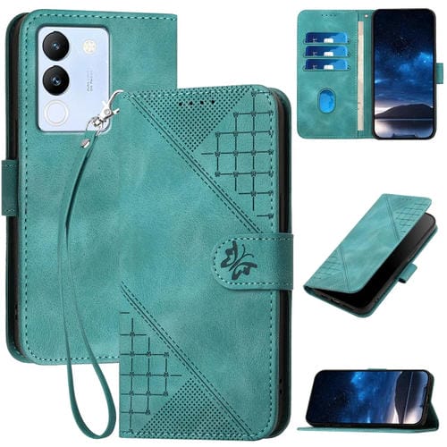 Funda de Cuero con Tapa y Cordón para Vivo V30 Lite 5G Global Yx0080 con Diseño En Relieve de Mariposa y Cuadrícula (Azul Claro)