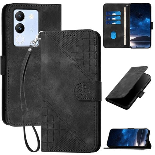 Funda de Cuero con Tapa y Cordón para Vivo Y200 5G Global Yx0080 con Diseño En Relieve de Mariposa y Cuadrícula (Negro)