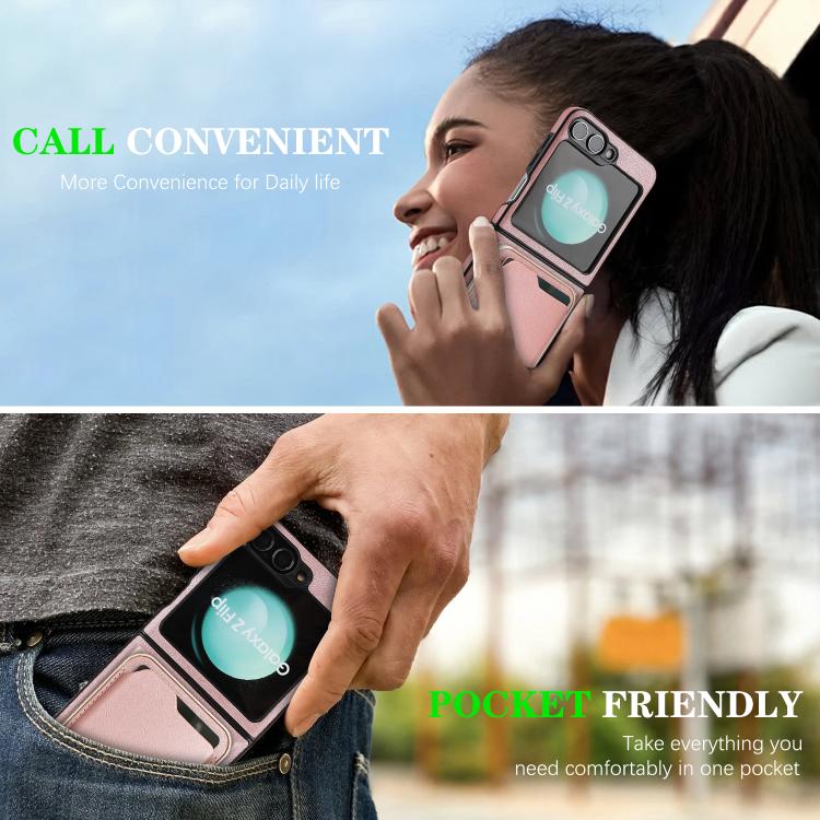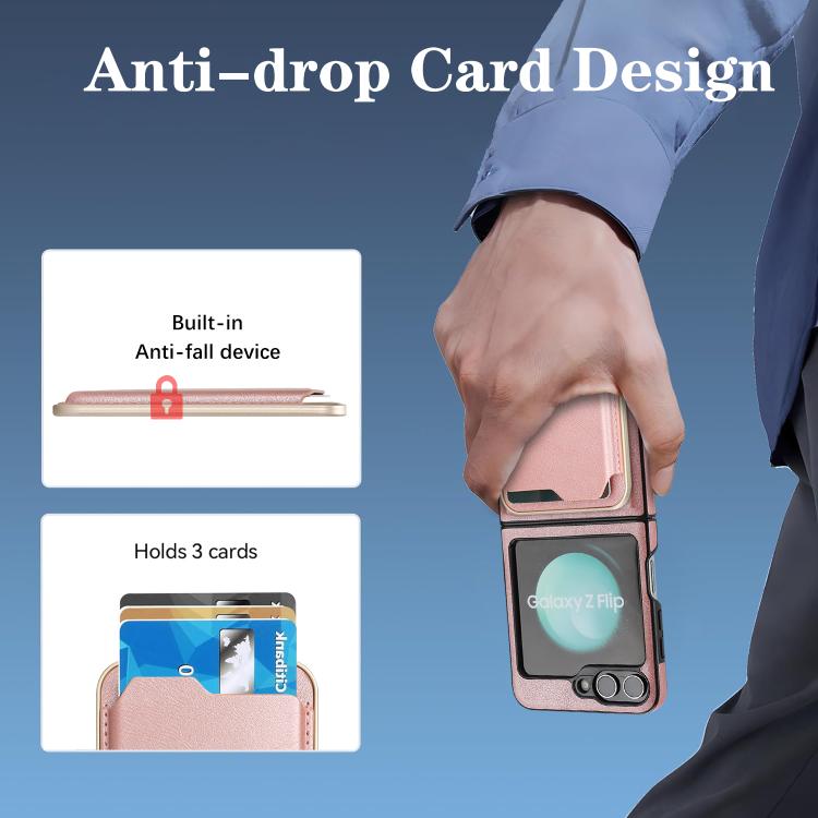 Funda de cuero Kalebol Slim MagSafe para Samsung Galaxy Z Flip6, con anillo magnético, etiqueta lateral y tarjetero (oro rosa)