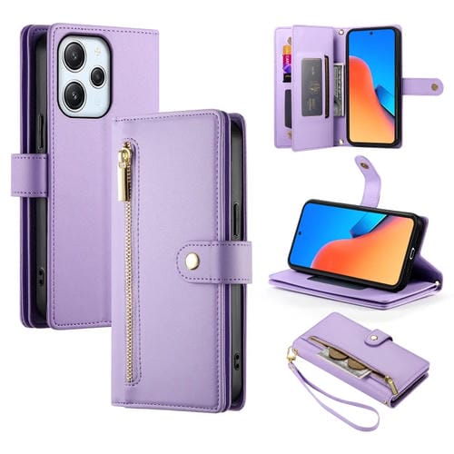 Funda de Cuero para Teléfono con Nueve Ranuras para Tarjetas y Cremallera para Redmi 12 5G/4G/Note 12R (Morado)