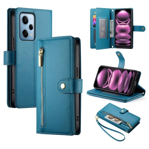 Funda de Cuero para Teléfono con Nueve Ranuras para Tarjetas y Cremallera para Redmi Note 12 Pro / Xiaomi Poco X5 Pro (Azul)