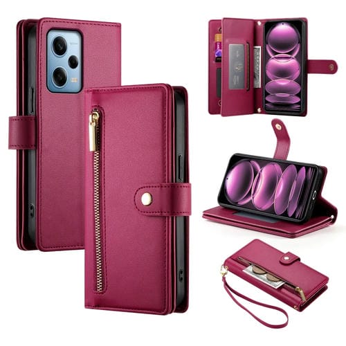 Funda de Cuero para Teléfono con Nueve Ranuras para Tarjetas y Cremallera para Redmi Note 12 Pro / Xiaomi Poco X5 Pro (Rojo)