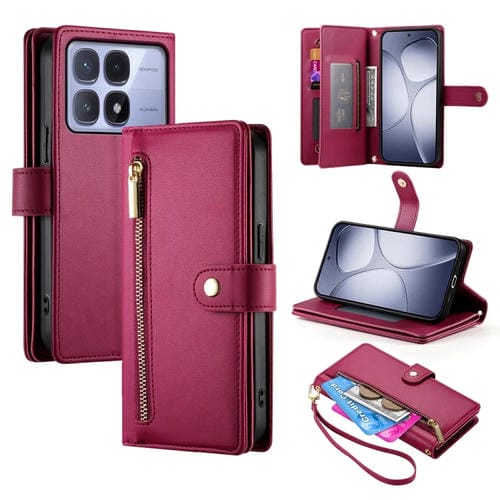 Funda de Cuero para Teléfono Redmi K70 Ultra con Nueve Ranuras para Tarjetas y Cremallera (Rojo)