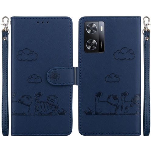 Funda de Cuero Rfid con Diseño de Gatos para Oppo A57 5G / A77 5G (Azul)