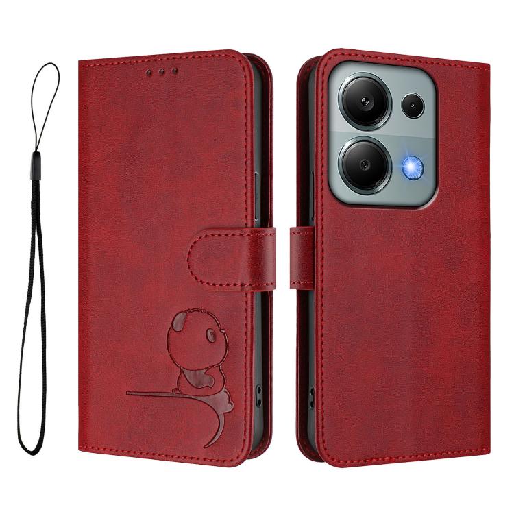 Funda de cuero RFID con estampado de panda y cordón para Redmi Note 13 Pro 4G / Note 14S (rojo vino)