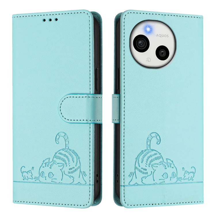 Funda de Cuero Rfid para Sharp Aquos Sense9 Plus con Estampado de Rata y Gato en Relieve y Cordón (Verde Menta)