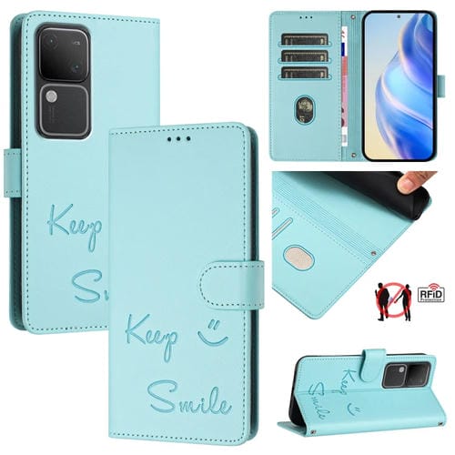 Funda de Cuero Rfid con Relieve de Sonrisa Global para Vivo V30 5G (Verde Menta)