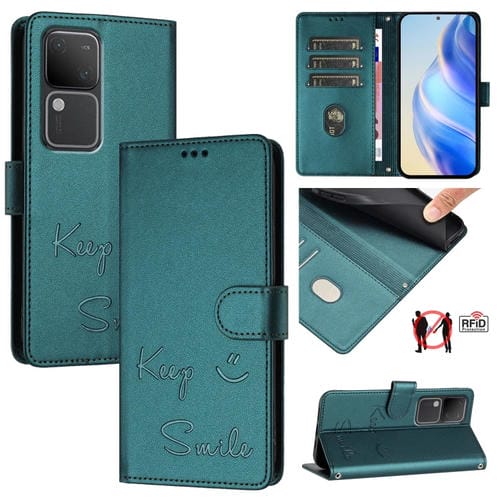 Funda de Cuero Rfid con Relieve de Sonrisa Global para Vivo V30 5G (Verde Pavo Real)