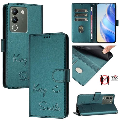 Funda de Cuero Rfid con Relieve de Sonrisa Global para Vivo V30 Lite 5G (Verde Pavo Real)
