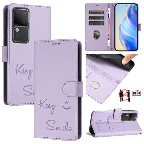 Funda de Cuero Rfid con Relieve de Sonrisa Global para Vivo V30 Pro 5G (Morado Claro)