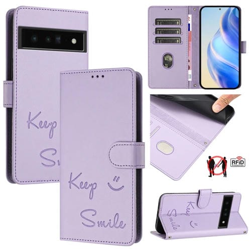 Funda de Cuero Rfid con Relieve Sonriente para Google Pixel 6 Pro (Morado Claro)
