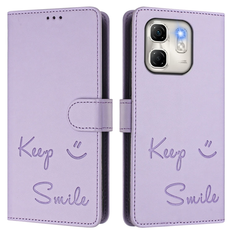 Funda de Cuero RFID con Relieve Sonriente para Infinix Hot 50I 5G y Smart 9 4G (Morado Claro)