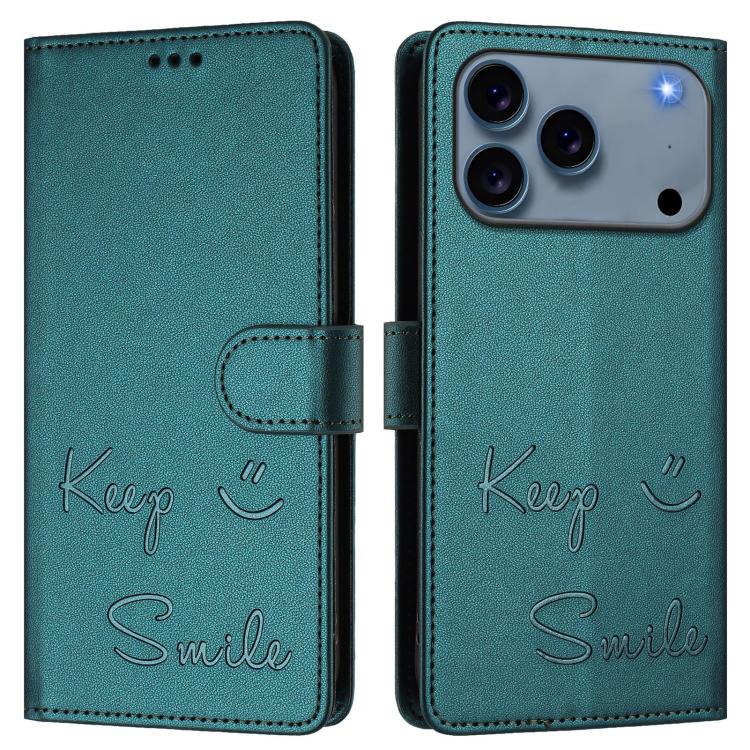 Funda de cuero RFID con relieve sonriente para iPhone 17 Pro Max (verde pavo real)