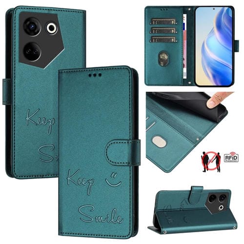Funda de Cuero Rfid con Relieve Sonriente para Tecno Camon 20/20 Pro 4G (Verde Pavo Real)