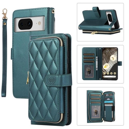 Funda de Cuero Tipo Billetera con Cremallera Completa y Diseño Romboidal para Google Pixel 8 (Verde)