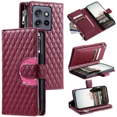 Funda de Cuero Tipo Billetera con Cremallera y Celosía Brillante para Motorola Edge 50 Neo (Rojo Vino)