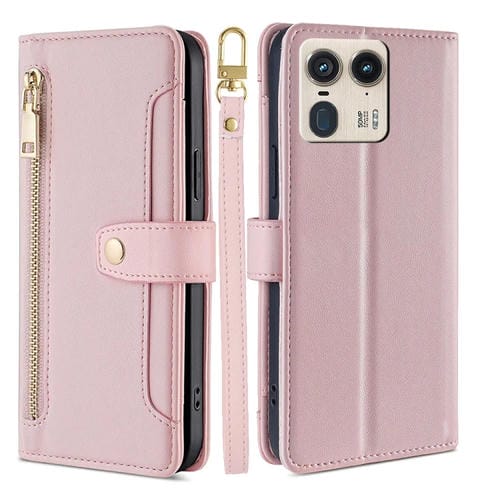 Funda de Cuero Tipo Billetera con Cremallera y Textura de Oveja para Motorola Edge 50 Ultra (Rosa)
