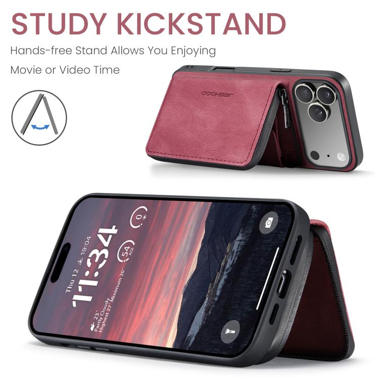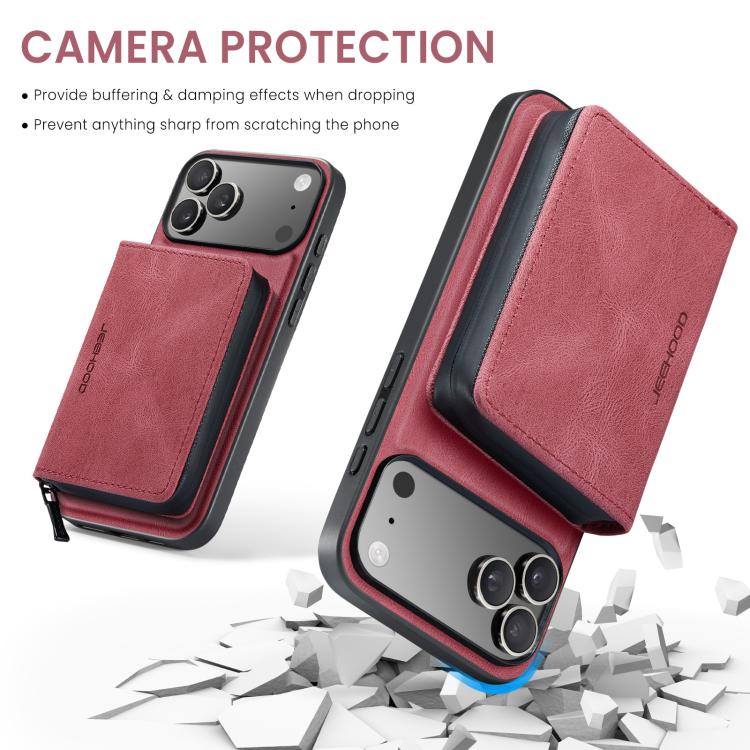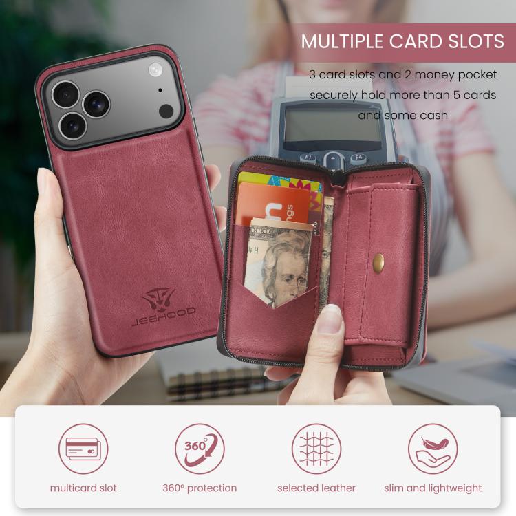 Funda de piel con cremallera magnética horizontal tipo libro JEEHOOD J02 para iPhone 17 Pro (Roja)
