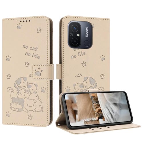 Funda de Piel con Diseño de Gatito En Relieve y Cordón para Xiaomi Poco C55 (Beige)