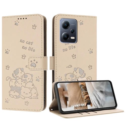 Funda de Piel con Diseño de Gatito En Relieve y Cordón para Xiaomi Poco X5 5G (Beige)