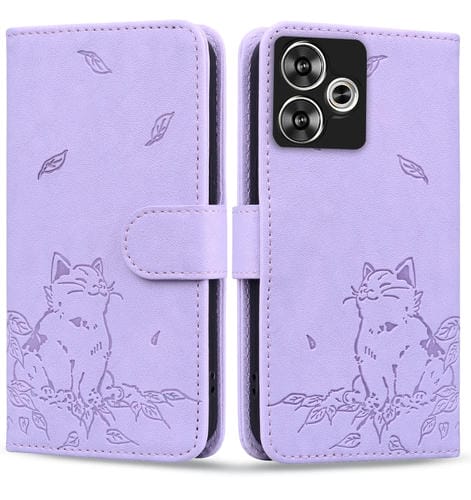 Funda de Piel con Estampado de Gato para Xiaomi Poco F6 (Morado)