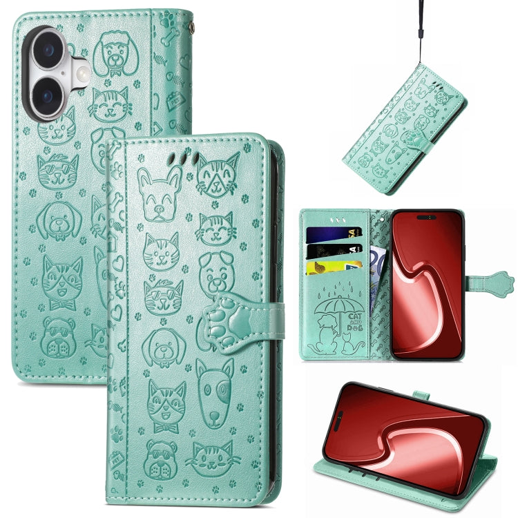Funda de piel iPhone 16 Estampado gato y perro (Verde)