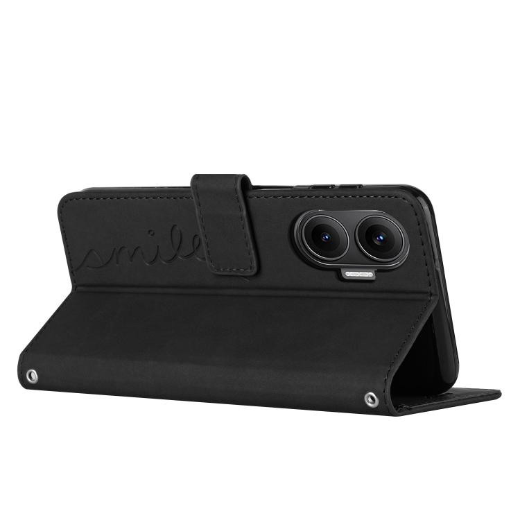 Funda de piel con relieve de corazón para Xiaomi Poco F7 con cordón largo (negro)