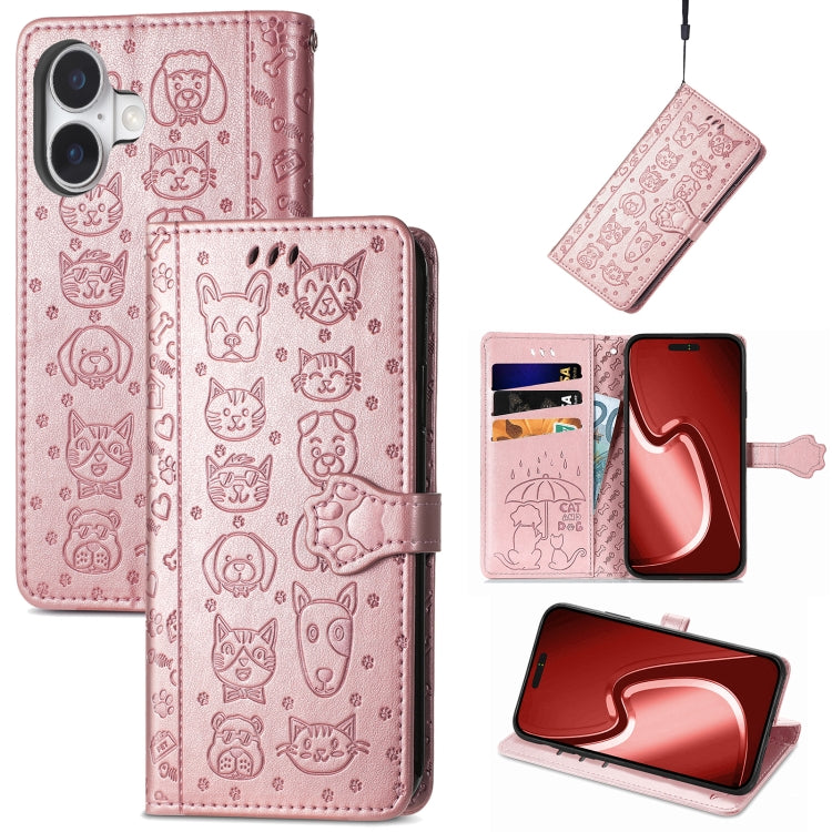 Funda de Piel con Relieve de Gato y Perro para iPhone 16 (Oro Rosa)