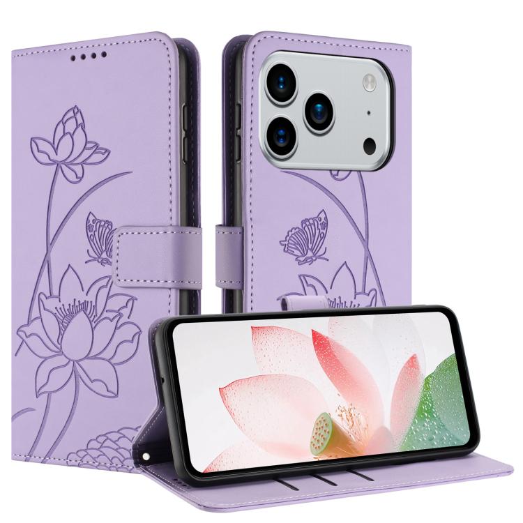 Funda de piel con relieve de loto para iPhone 17 Pro con cordón (morado)