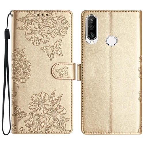 - 1x Funda de PU con relieve de mariposa y flor de cerezo para Huawei Y6P (Dorada)