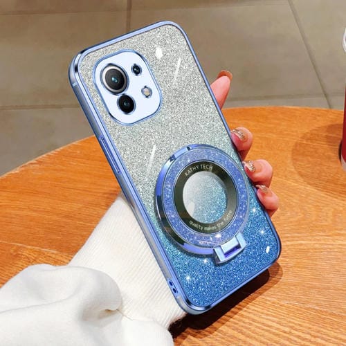 Funda de Teléfono de TPU con Soporte Redondo y Purpurina Degradada Plateada para Xiaomi Mi 11 (Azul Sierra)