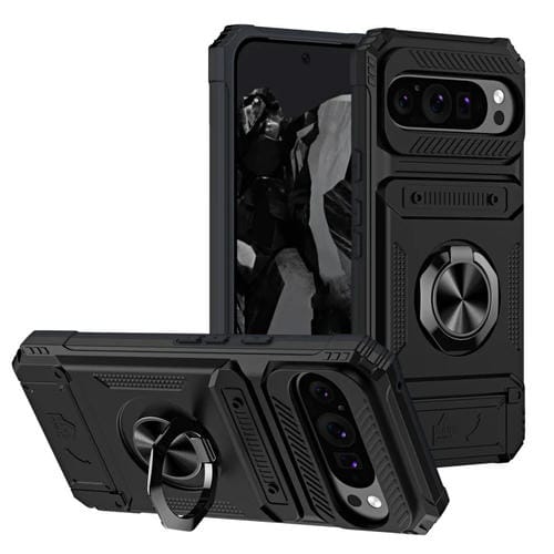 Funda híbrida TPU y PC para Google Pixel 9/9 Pro con soporte anillo de metal (Negro)