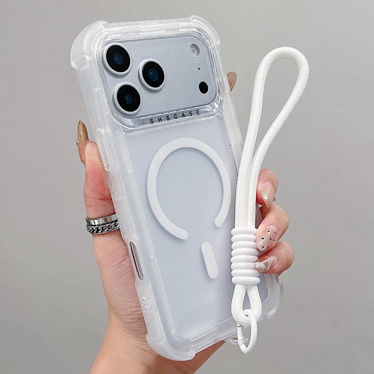 Funda híbrida de TPU y PC transparente mate 3 en 1 MagSafe para iPhone 17 Pro Max con correa de muñeca (blanca)