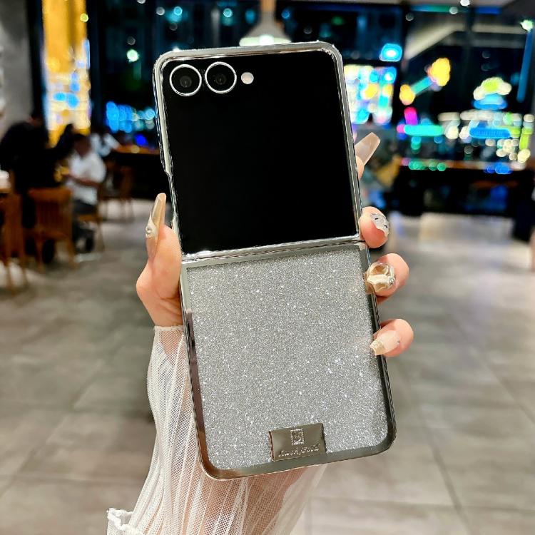 Funda para Samsung Galaxy Z Flip7 5G con marco chapado, placa de identificación de papel brillante y cobertura total (plateada)