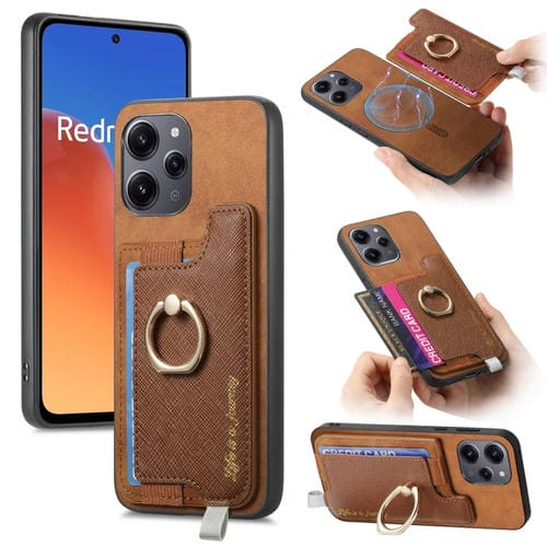 Funda para Teléfono con TaRJetero y Anillo de Cuero con Diseño Retro Magsafe para Redmi 12/Note 12R/Poco M6 Pro 5G (Marrón)