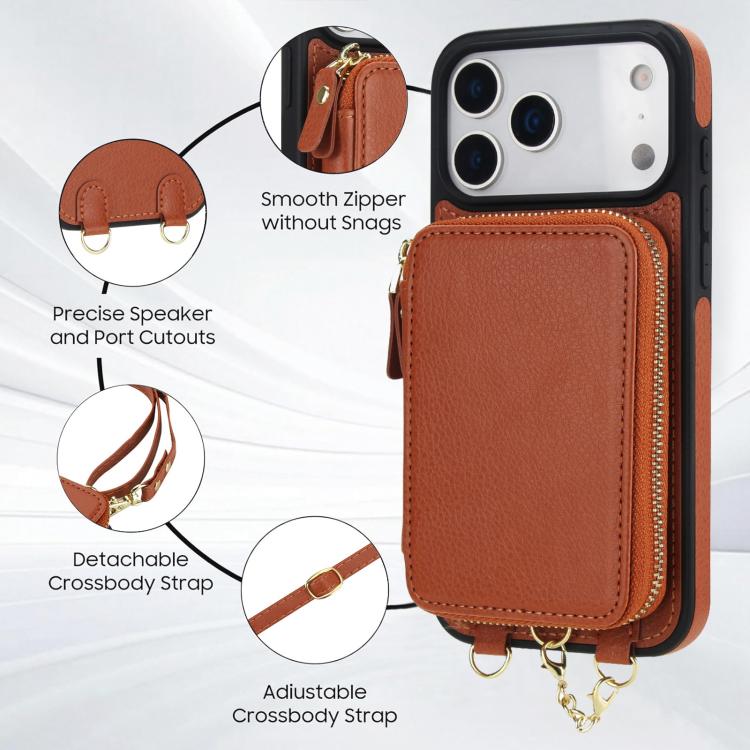 Funda tipo cartera bandolera con cremallera AwQuer 2 en 1 para iPhone 17 Pro Max con parte trasera de cuero (marrón)