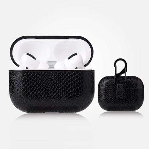 Funda Protectora para Airpods Pro Cuero PU Textura Piel de Serpiente Anticaída con Mosquetón (Negro)