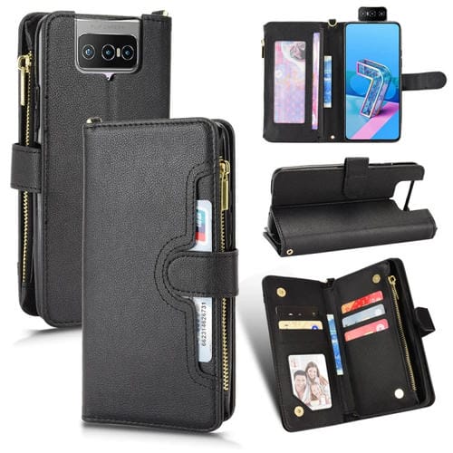Funda de Cuero para Asus Zenfone 7 Pro ZS671KS con Textura Litchi y Cremallera (Negro)