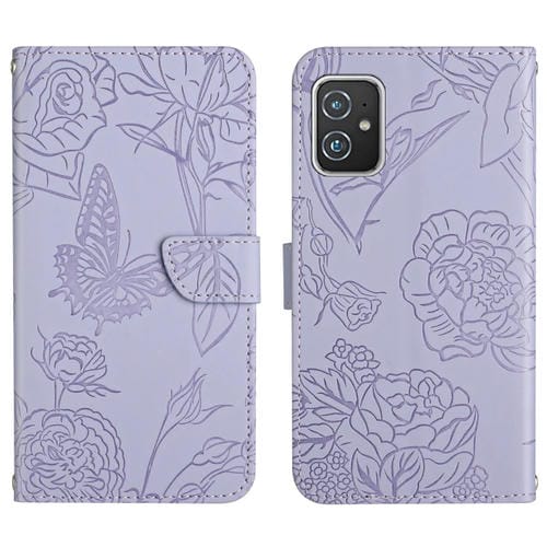 Funda de Cuero para Asus Zenfone 8 Zs590Ks con Relieve Peonía y Mariposa (Púrpura)