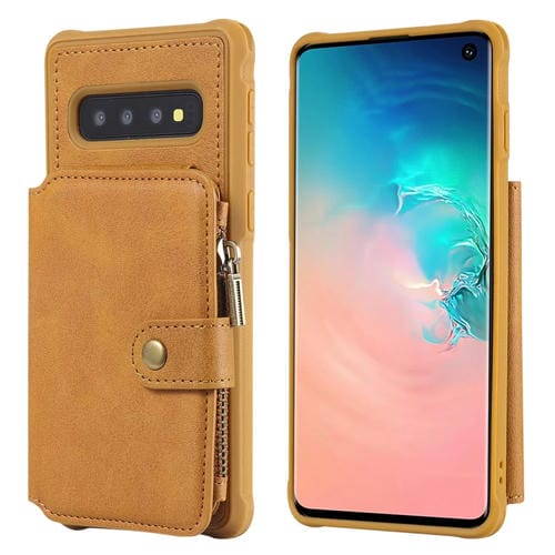 Estuche Protector Galaxy S10 con Cremallera Ranuras para Tarjetas Soporte y Billetera (Marrón)