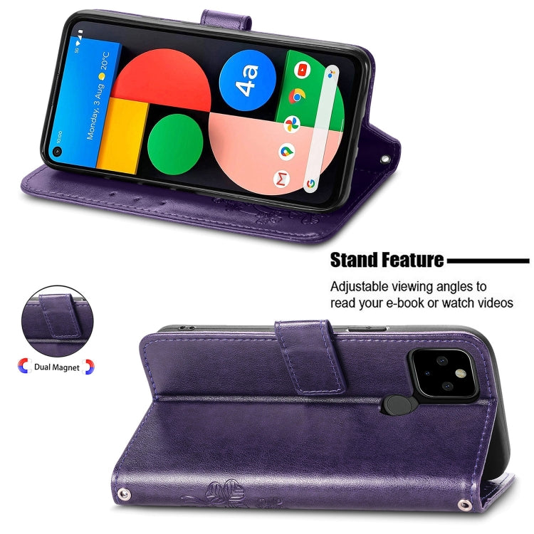 Para Google Pixel 5a Cierre de cuatro hojas con hebilla en relieve Protección de teléfono móvil Funda de cuero con cortante y ranura para la tarjeta y la función de la billetera y el soporte (púrpura)