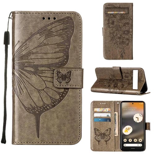 Funda de Cuero para Google Pixel 7A con Tapa de Mariposa en Relieve (Gris)