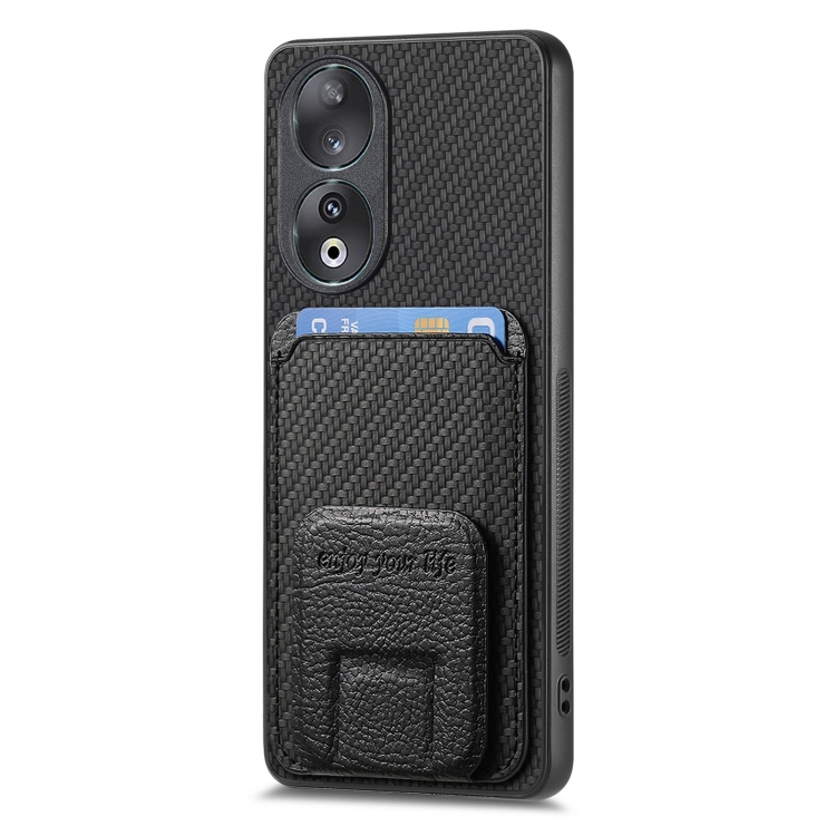 Funda para Honor 100 5G con Soporte Plegable y Bolsa para Tarjetas de Fibra de Carbono (Negro)