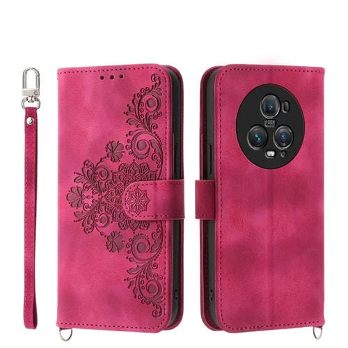 Funda de Cuero con Billetera para Honor Magic5 Pro Skin-Feel Flowers (Rojo Vino)