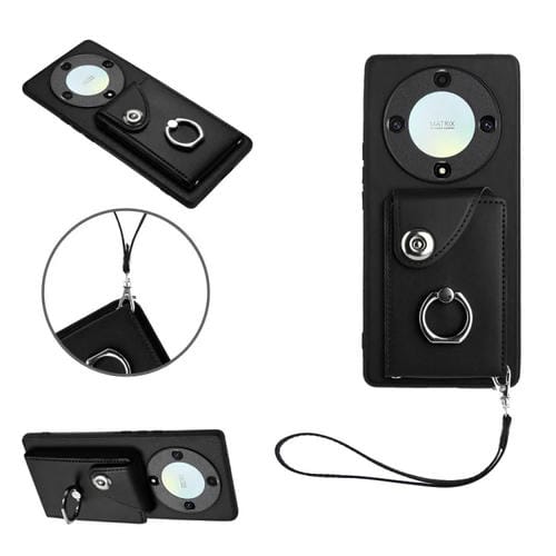 Funda para Honor X9A y Magic5 Lite de PU con Soporte para Anillo y Bolsa para Tarjeta con Cordón (Negro)