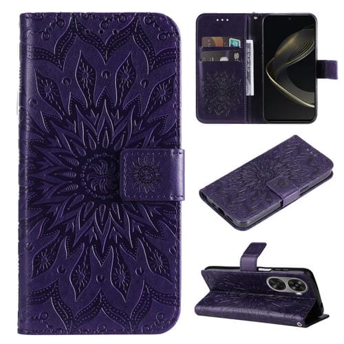 Funda para Huawei Nova 12 Se y Nova 11 Se de Cuero con Tapa y Patrón de Girasol en Relieve (Púrpura)
