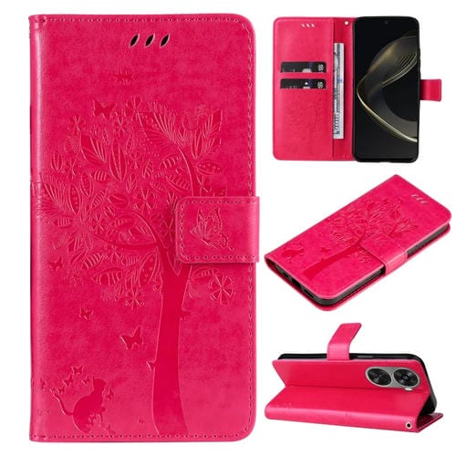 Funda para Huawei Nova 12 Se y Nova 11 Se de Cuero con Tapa y Patrón en Relieve Árbol y Gato (Rojo Rosa)