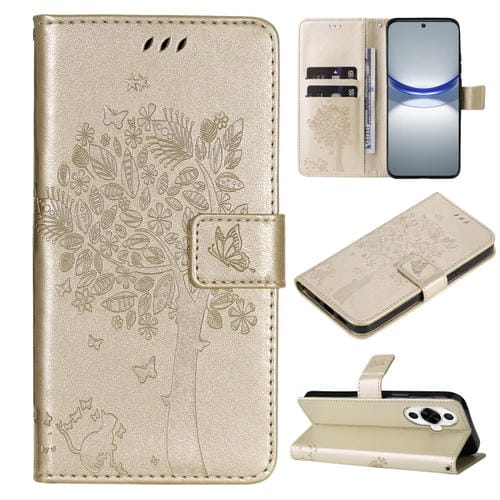 Funda para Huawei Nova 12S de Cuero con Tapa y Patrón en Relieve de Árbol y Gato (Dorado)